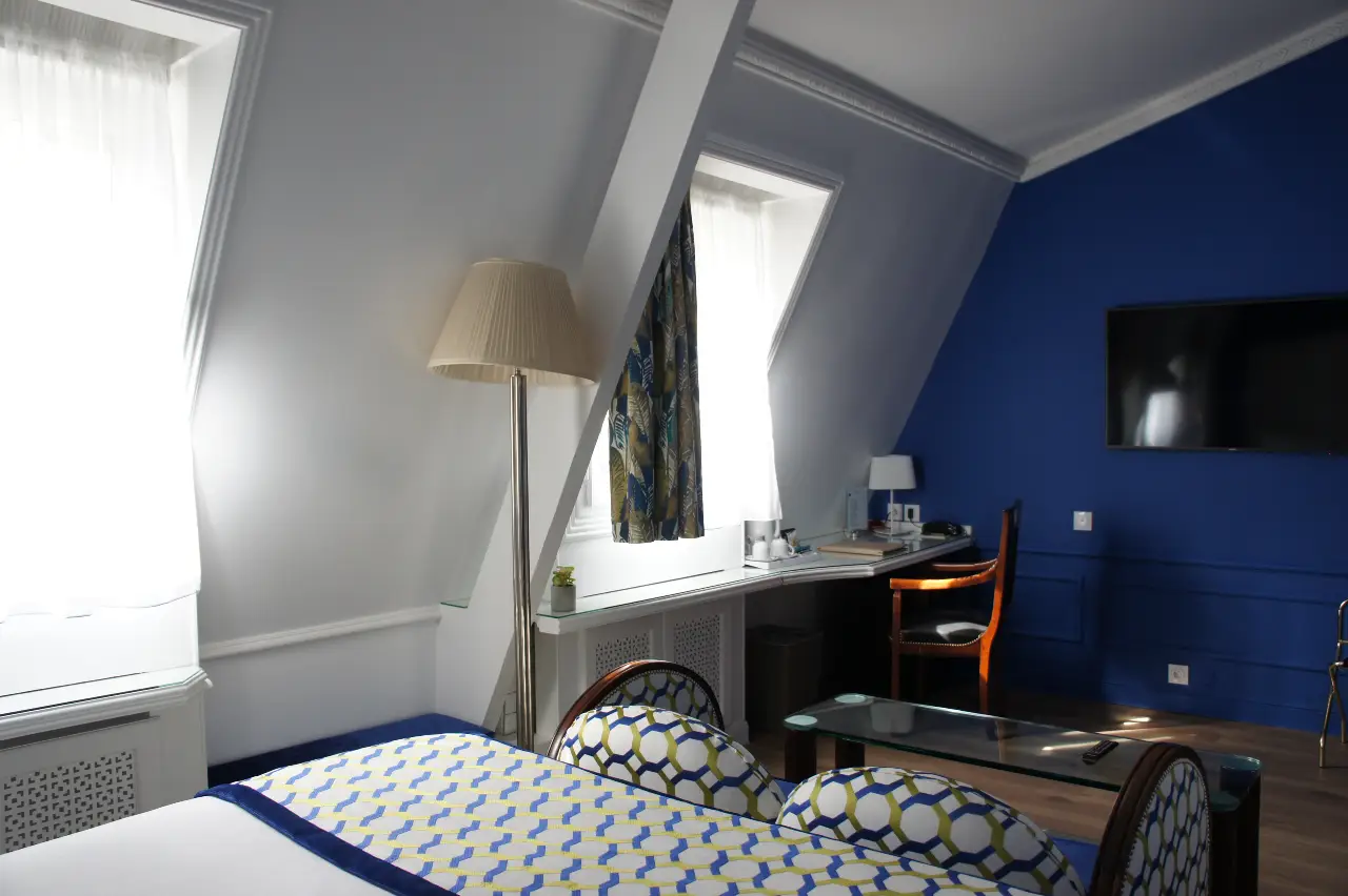 Robert And Cau a eu l’immense plaisir de mener la rénovation des chambres de l’hôtel Eiffel Trocadéro : un sublime hôtel 4 étoiles en plein cœur de Paris, à deux pas de la Tour Eiffel. Le concept de cette rénovation repose sur la création d’une ambiance typiquement parisienne : têtes de lits imitant les pieds de la Tour Eiffel, papiers peints reproduisant les toits de Paris… L’aménagement global et le choix du mobilier joue avec l’architecture sous pente et les murs inclinés de ces magnifiques chambres mansardées.